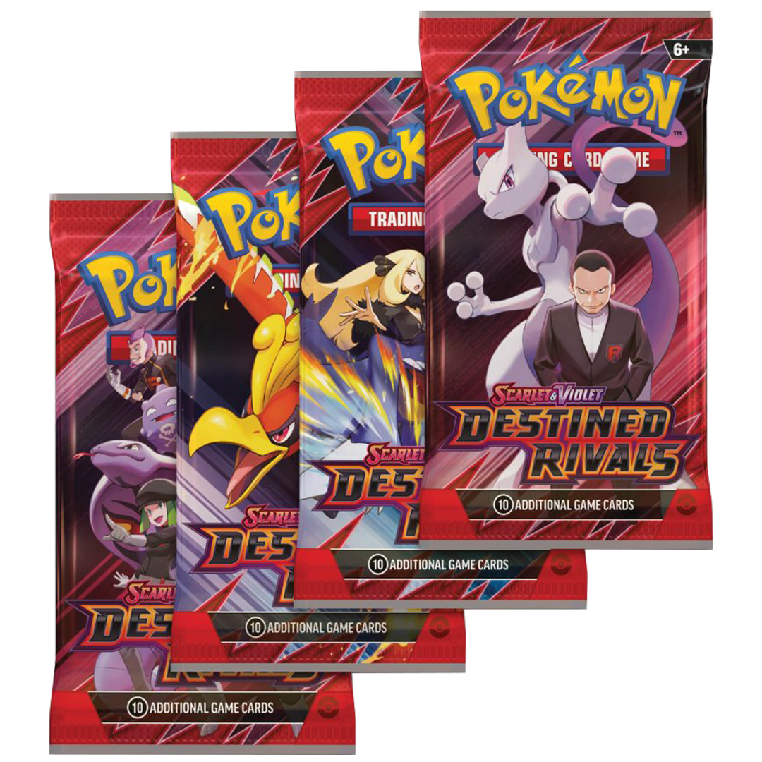 Pokémon Trainers, be on high alert! The nefarious Team Rocket is setting its latest plan into motion, and heroic Trainers are racing to stop it. Join forces with the likes of Cynthia and Garchomp ex, Ethan and Ho-Oh ex, or Arven and Mabosstiff ex… Or reconsider your loyalties and fight alongside Team Rocket’s Pokémon like Mewtwo ex—under the command of Giovanni! Choose a side, assemble your allies, and battle boldly in the Pokémon TCG: Scarlet & Violet—Destined Rivals expansion!