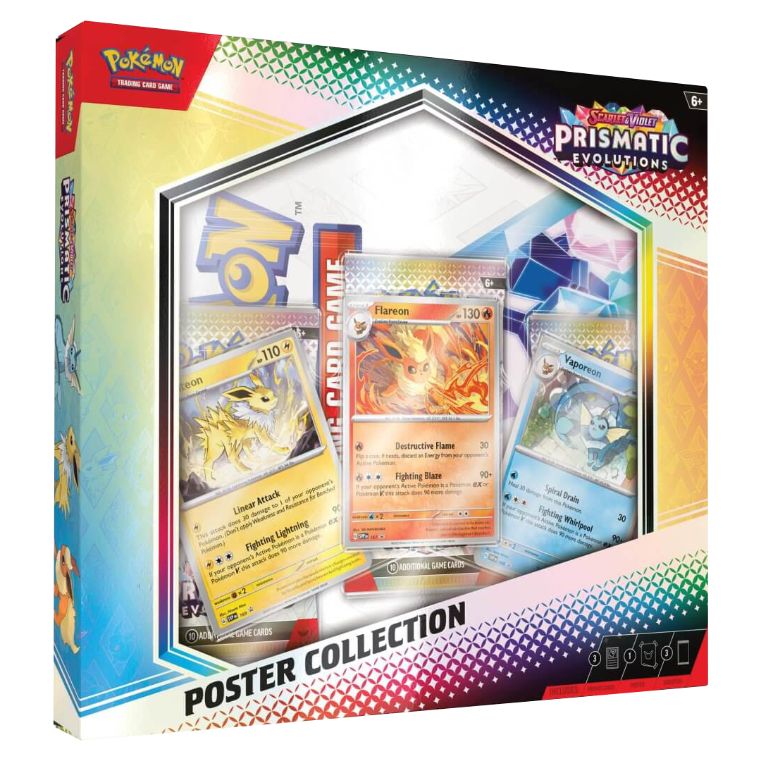 The Pokémon TCG: Scarlet & Violet—Prismatic Evolutions Poster Collection includes: