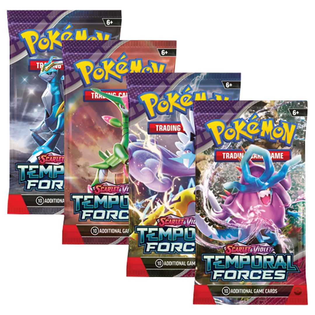 The ranks of Ancient and Future Pokémon continue to grow! Walking Wake ex breaks free of the past alongside Raging Bolt ex, while Iron Leaves ex delivers high-tech justice with Iron Crown ex. Outside Area Zero, Wugtrio and Farigiraf shift types as Tera Pokémon ex, and Pokémon Trainers everywhere prepare for the return of ACE SPEC cards with uniquely powerful effects. A rupture in time brings wild beasts and cyber visions to battle in the Scarlet & Violet—Temporal Forces expansion!