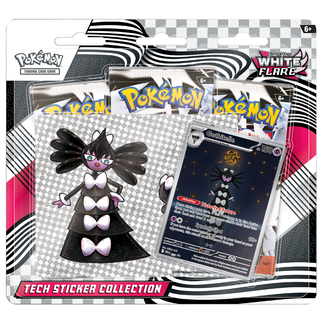 Gothitelle can see the future in the stars—perhaps it knows which path you’ll take! Team up with the Astral Body Pokémon as a foil promo card, then decorate your computer, tablet, or phone with durable tech stickers featuring the full Evolution chain: Gothita, Gothorita, and Gothitelle! Then, find more Pokémon first discovered in the Unova region when you open three booster packs from the special Scarlet & Violet—White Flare expansion!